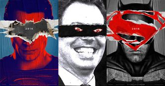 The two posters – one featuring Superman with a torn bat obscuring his eyes and a reciprocal image of Batman with a Superman S ripped into his features – are eye-catching if perhaps not wholly original…