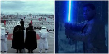 Yes it’s on 15 seconds long, but those few moment see a gathering army and Finn wielding a blue lightsabre ready to fight a cloaked figure.