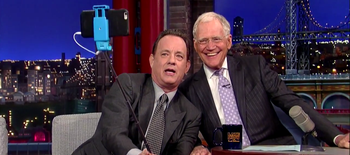 Not only does Hanks nearly break the thing, but he tries convincing Letterman that it’s not naff because they sell ‘selfies’ in Florence, “the birthplace of the Renaissance”.