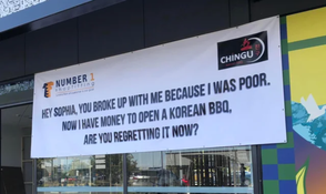 Addressed to a Sophia, the sign reads: You broke up with me because I was poor. Now I have money to open a Korean BBQ, are you regretting it now?”
