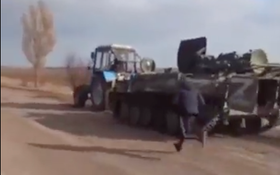 As illustrated in the now-viral video below, a tractor can be seen towing a Russian armoured vehicle away as a man tries to chase it down a dirt road: