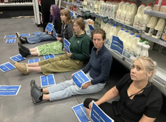 Animal Rebellion wrote on Facebook on Saturday: “Supermarkets in 4 different cities have had their dairy aisles blocked by Animal Rebellion supporters!