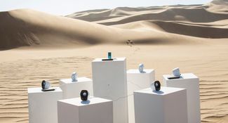 The whole art installation consists of seven white plinths sitting in the desert with six speakers and one MP3 player.