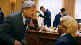 James Corden portrays Mueller while Shaggy plays Donald Trump and spits lines like: