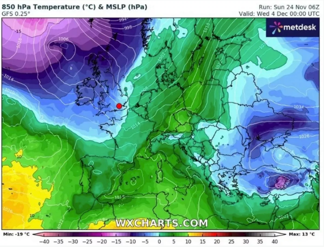 According to weather maps from WX Charts, most of the UK will experience temperatures between 0-5C. However, a large, ominous purple area of much lower temperatures can be seen approaching the country in the top left corner of the chart, which is a forecast for Wednesday 4 December.