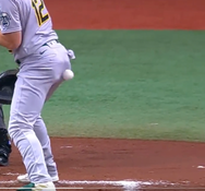 During the first inning of Oakland Athletics, also known as the A’s, clash with the Tampa Bay Rays at Tropicana Field in Florida on Monday, Sean Murphy, 27, stuck out his bum just as pitcher Chris Mazza threw the ball.