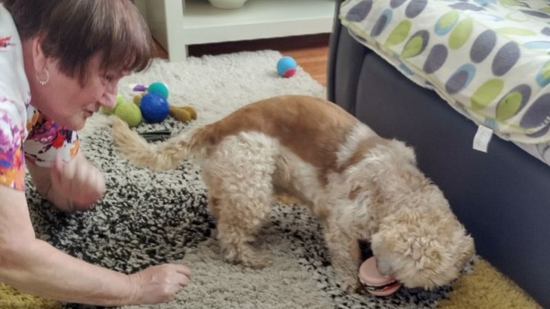 82-year-old, Ms Newhall, who has now given Morris his forever home says he loves ‘playing with his tenis ball’ and enjoys it when her daughter comes round with her dog.