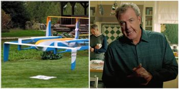 Jezza delivers a dry and sarcastic explanation of how Amazon drone deliveries work saying how packages can be whizzed through the air and dropped at the desired location within 30 minutes.