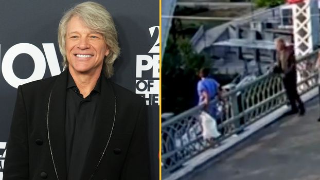 Further down the bridge, Bon Jovi’s team could be seen setting up camera equipment. Whilst other people pass the woman, the singer walks down the bridge with one of his team and starts waving hello to her.