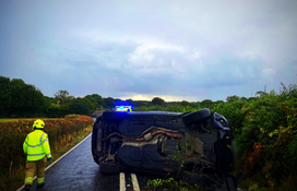 A photograph tweeted by a local police officer of the crash showed a damaged BMW lying on its side across both lanes, its front lodged in the hedgerow, after the crash.