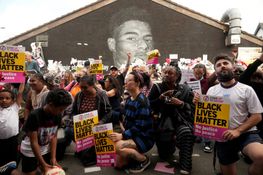 Demonstrators who turned out in their numbers at a mural of Marcus Rashford all took the knee in a show of support of the Manchester United player.