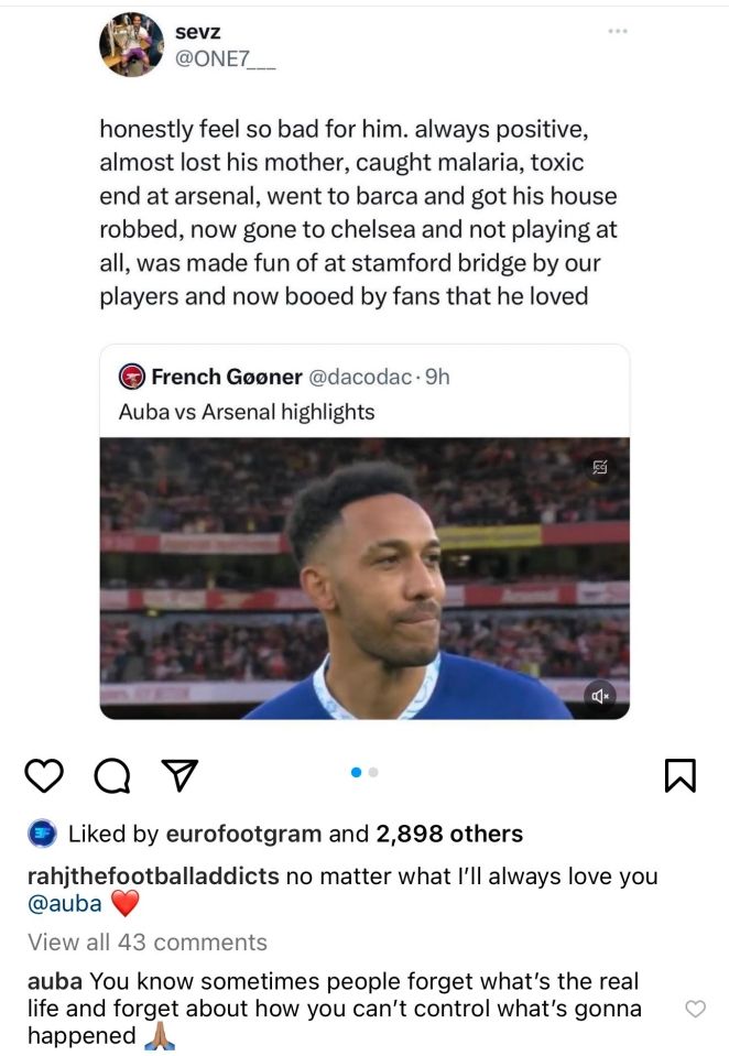A post, which was captioned: “No matter what I’ll always love you Auba,” was followed up by a written post which said: “Honestly feel so bad for him.