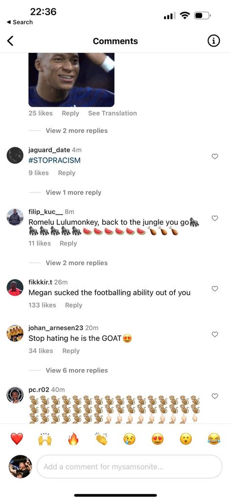 However the game was marred at full time as comments on some of Lukaku’s previous Instagram posts were filled with racially insensitive comments in reference to his performance during the game.