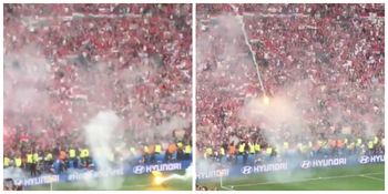 Now, new footage shows just how dangerous the situation was in the Hungarian fans’ section at the Stade Vélodrome. The video below shows the flaming devices being lit in the stands, then thrown onto the pitch. A linesman grabs the flare and runs off with it. Seconds later another lit flare is lobbed into the air, but instead of landing on the pitch, lands in a fan area just in front of the pitch.