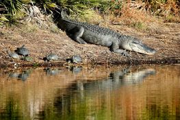 Seven-stone Mavis was being taken for a stroll by her owner in Arlington Park when an Alligator leapt out of the water and ate her.