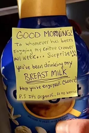 It read: “Good morning! To whomever has been enjoying my coffee creamer all week… surprise! You’ve been drinking my breast milk. Hope you’ve enjoyed. Cheers!”