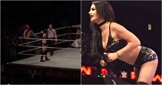 During a tag-team match at Nassau Coliseum, Paige struggled to get back to her feet after being kicked in the back by Sasha Banks.