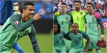 The 31-year-old can be seen up on his tip-toes as his Portugal side posed for a pre-game team photo ahead of the semi-final clash with Wales (the photo that was gloriously photobombed by this cheeky young fan as 12th man).