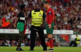 The incident took place 10 minutes into the second half of Portugal’s 3-0 win against Bosnia and Herzegovina as the fan ran onto the pitch before making a beeline for Ronaldo.