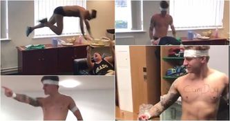 This is just a professional footballer dressed up as a wrestler, with ‘Cumdog’ scribbled across his chest, competing against a Scottish wrestler to the tune of Madonna’s Like A Prayer.