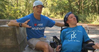 During the Ironman competition, Brent will pull Kyle along in an inflatable kayak during the swim. During the bike event, Kyle will lie on his back at the front while Brent pedals in the rear. For the marathon, Brent will push Kyle, who will be seated in a racing wheelchair.