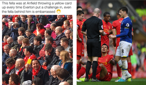 As shown by this tweet from an Evertonian sitting in the away end, the man channelled his inner Mike Dean every time a Liverpool player was on the wrong end of a challenge from an Everton player.