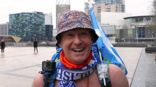 But have you ever found yourself wondering exactly why this man would subject himself to the elements in nothing more than some swimming trunks? Well, it’s for charity, and attending football matches isn’t all he’s doing.