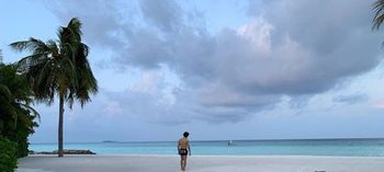 How could he not? He’s got a little pool, some sand, blue skies and a massive pool AKA the ocean right on his doorstep.