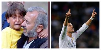 Zied (anak pengungsi dr Suriah) gandengan sama Cristiano Ronaldo dan jalan kaki masuk lapangan Bernabeu. http://t.co/sgPw2ZHUzJ