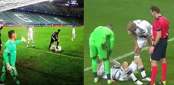 Ronaldo leaped into the air to try to head the ball, but was beaten to it by the defender, who lost his balance and fell backwards as he made his clearance. Ronaldo landed on his feet, but the momentum caused him to stumble backwards towards the grounded defender.