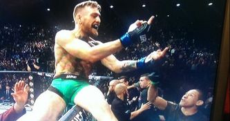 As referee John McCarthy waved the featherweight title unification bout off, McGregor scaled the octagon and made a gesture to the crowd before sticking his middle finger up to someone in the crowd.