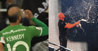 The third – a sweet 30-yard free kick – caused electric celebrations which saw a beer (in a plastic glass) thrown from the crowd towards the 37-year-old. Rather than attempt to evade the beverage by ducking, Kennedy instead chose to successfully catch it and – stunningly – down it all in one fell swoop.