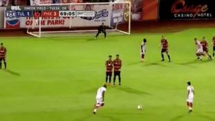 It looks to be from about forty yards out, and while the keeper gets a touch to it, the power on the shot was simply too much.