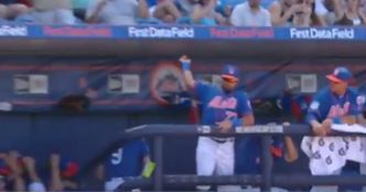 Miami’s Adeiny Hechavarria’s grip came loose when he was batting causing the bat to slip out of his hand and go speeding towards the Mets’ dugout. The players in the trajectory of the flying head-basher all ducked for cover… except one.